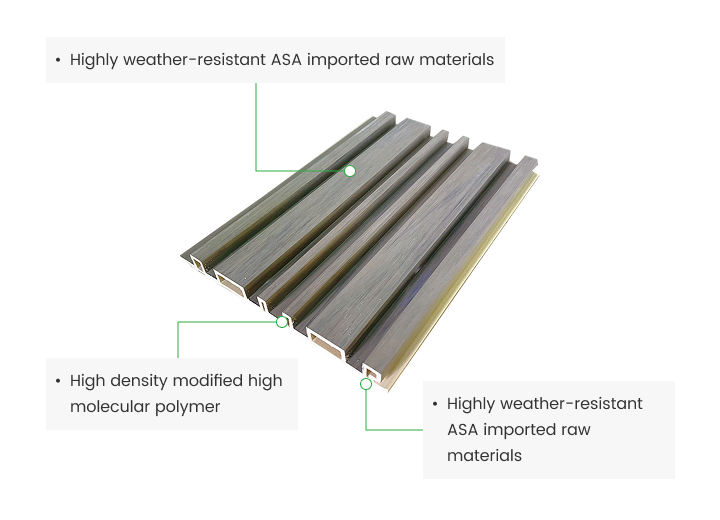 The raw materials of ASA Co-extrusion WPC are PVC, PMMA, ASA and wood fibers. Carbon fibers can also be incorporated into the core layer of the product, enabling the product to be similar to a reinforced concrete structure and ensuring that it will not deform or crack. ASA Co-extrusion WPC is lighter in weight, more ductile and stronger in strength compared to traditional WPC. It is mainly applied to building exterior walls, outdoor landscapes, garden pergolas, planting boxes, and other areas.