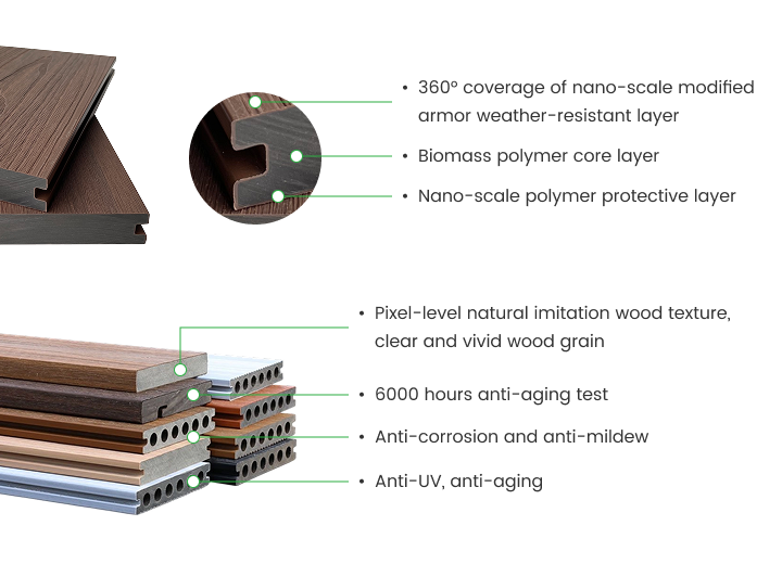 Co-extrusion WPC series is manufactured using high-strength HDPE and plant fibers through adhesive-free co-extrusion. Its surface is coated with high-molecular nano weather-resistant modified materials, ensuring "zero" water absorption in the core. This fundamentally prevents mold, rot, and other issues, achieving a maximum 25-year quality guarantee.